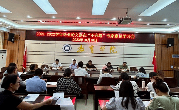 2023年10月16日下午,教育学院在1B-412会议室召开2021-2022学年毕业论文存在“不合格”专家意见学习会,参加学习会的有我院周顺平院长、黎茂昌副院长等领导和全体教职工,会议由周顺平院长主持。