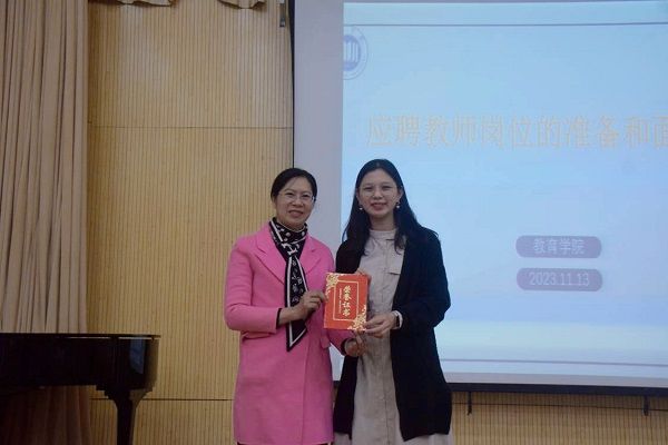 讲座伊始,洪副校长与同学们分享了应聘教师岗位需要进行的充分准备和要运用到的一些面试技巧。随后,洪副校长与同学们强调面试过程中应注意的细节,微至面试服装、得体仪容,巨至从容教态、教学技巧,面面俱到。紧接着,洪副校长又明确指出教案设计、试讲稿语言、说课稿语言、答辩的具体注意事项,并在现场模拟了答辩环节,与同学们展开了精彩的互动,此环节取得良好的效果。最后,洪副校长给同学们展示了钦南区公开招聘中小学幼儿园教师试讲、答辩评分参考,让同学们以身临其境的方式深刻把握,并预祝同学们面试取得圆满成功。