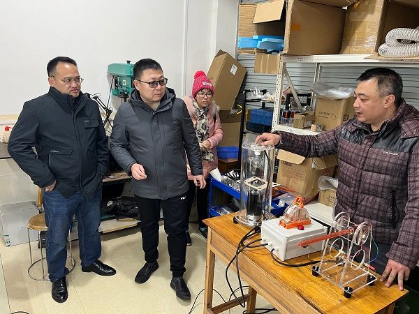 尹闯(左一)参观桂林市创坊教育技术开发有限公司产品——电磁炮