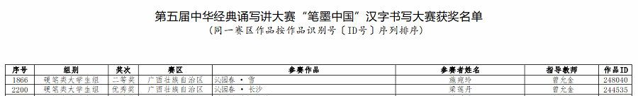 为贯彻落实中共中央办公厅、国务院办公厅《关于实施中华优秀传统文化传承发展工程的意见》和全国语言文字会议精神,全面深入实施中华经典诵读工程,教育部和国家语委办组织的第五届中华经典诵写讲之“笔墨中国”汉字书写大赛。我院小学教育专业师范生施宛玲、梁莲丹在此次比赛中继荣获广西区赛一等奖、二等奖后,在近期国赛官网获奖名单公示中,相继荣获了国赛二等奖和优秀奖。