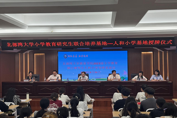 为了深化校地合作,深度推进小学教育专业学位研究生的培养,北部湾大学教育学院与钦州市人和小学于4月26日,在人和小学正和讲堂隆重举行了小学教育研究生联合培养基地授牌仪式。北部湾大学教育学院党委书记叶汝坤,副院长尹闯,何雪玲、陆璇璇、王文娟等老师参加此次活动。人和小学张华如校长发表讲话,林海华副校长主持本次活动。