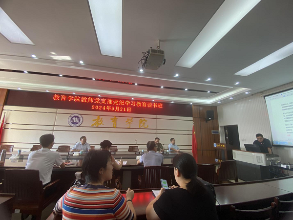 5月21日下午,教师党支部在1A-412会议室举办第二次党纪学习教育读书班,读书班由党支部书记张珂主持,支部全体党员参加。