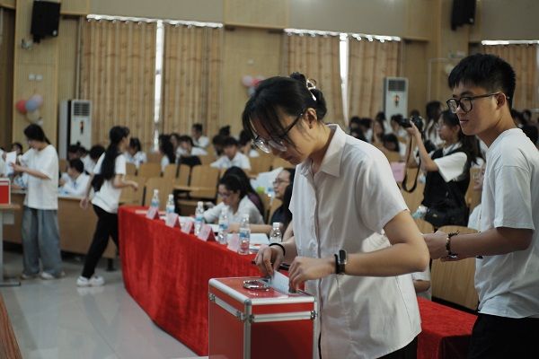 正式会议伊始,全体成员起立奏唱国歌。随后,院党委副书记陈鹏为本次大会致辞。他充分肯定了过去一年学生会的工作成绩,并殷切希望广大青年学子努力拼搏,紧握时代接力棒,为实现中华民族伟大复兴不懈奋斗!接着,校学生代表于军秋致贺词,祝愿我院学生会工作的顺利开展。而后,全体人员听取和审议了院学生会执行主席周奕君关于北部湾大学教育学院第五届学生会工作报告。紧接着,主持人宣布通过总监票人和监票人总计票人和计票人名单,宣读主席团候选人名单。在四位候选人依次上台进行竞选演说后,学生代表根据每位候选人的介绍和表现进行民主投票,最终选举产生了由陈姝毓、苏宇玲、方彦清三位同学组成北部湾大学教育学院第六届学生会主席团。