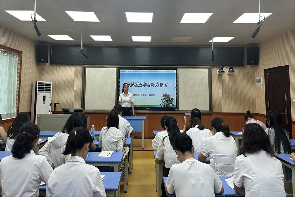 在本次见习活动中,师生观摩了子材小学优秀教师朱丽坤老师的五年级复习研讨课《Reviewl》。朱老师整合了一般过去式的变化和用法的内容,以chant一环为引领,设计了听、说、读、写、看五项活动,复习了模块的重点内容。课堂上,朱老师带领学生温习已学过的知识,并通过学习理解、应用实践、创造迁移等活动引导学生探究一般过去式的正确使用方法。朱老师教学目标明确、教学活动设计有梯度,课堂情境的设置与学生生活联系紧密,课堂练习题型多元化,课堂中注重“教-学-评”一体化的实施,充分发挥了学生的学习主动性,学生学习氛围浓厚。在课堂结束后,朱老师对自己的教学设计和教学效果进行了反思,参加活动的教师们积极发言,对本节课的亮点给予了充分的肯定。最后由庞金红老师做闽教版五年级听力复习经验分享,庞老师从听力题型、方法技巧等方面提出英语复习工作的建议,针对小学英语听力的复习可以利用课前抽背、口语训练等渠道,通过上下册教材整理分类,帮助学生对词汇、句型、对话、短文等进行全方面的复习,同时还要教给学生完成不同题型的方法和技巧。