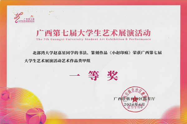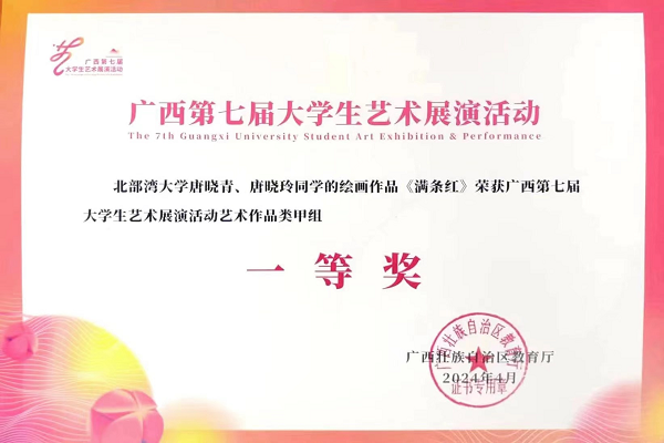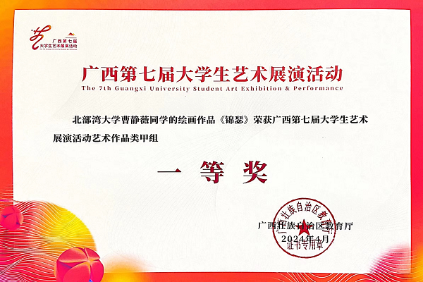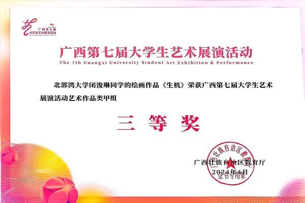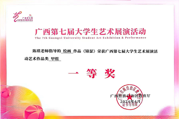 艺术作品类甲组一等奖;指导学生闭浚琳创作的绘画作品《生机》荣获广西第七届大学生艺术展演活动艺术作品类甲组三等奖。