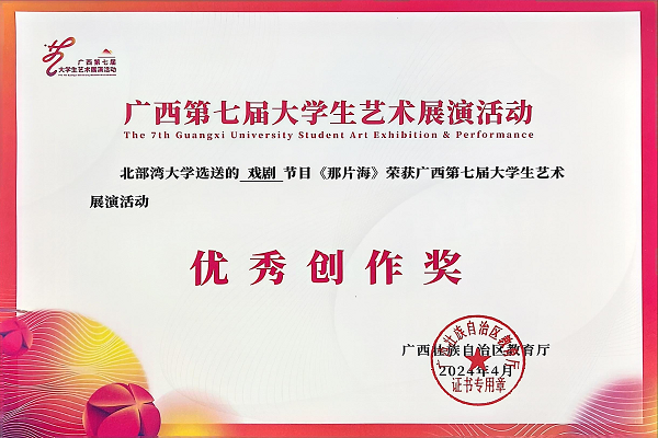 刘志鹏、王婉聪、马秀明指导的戏剧节目《那片海》荣获广西第七届大学生艺术展演活动艺术表演类甲组一等奖,广西第七届大学生艺术展演活动优秀创作奖。