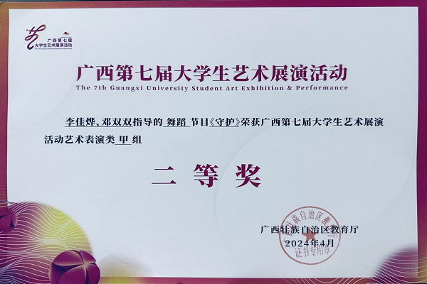 李佳烨、邓双双老师指导的舞蹈节目《守护》荣获广西第七届大学生艺术展演活动艺术表演类甲组二等奖。