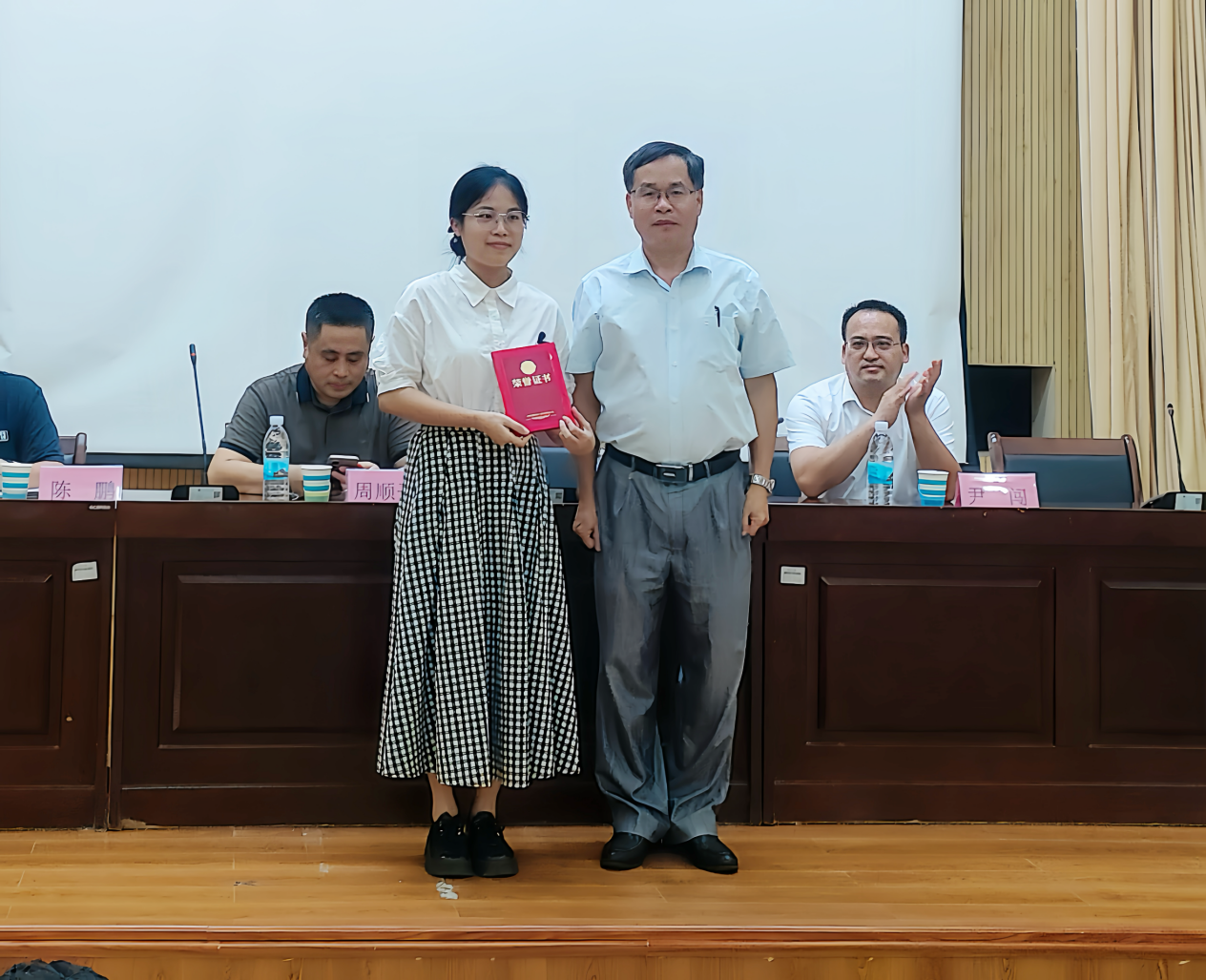 会议伊始,陈鹏副书记致开场词。而后,陈鹏副书记宣读2023-2024学年学院先进教学工作者、先进科研工作者和优秀党务工作者表彰系列决定,获奖老师上台领取荣誉证书并合影留念。随后,青年教师代表施又丹上台发言,她表示作为一名教育工作者应不忘初心,开拓进取,为推动教育事业的发展贡献智慧和力量。此外,学生代表陆悦上台发言,表达了对老师们的感激之情,并表示将会继续努力学习,不辜负老师的谆谆教导。最后,叶汝坤书记发表讲话,并勉励全体教师不忘立德树人初心,加强师德师风、教风学风和教育教学建设,争创佳绩。