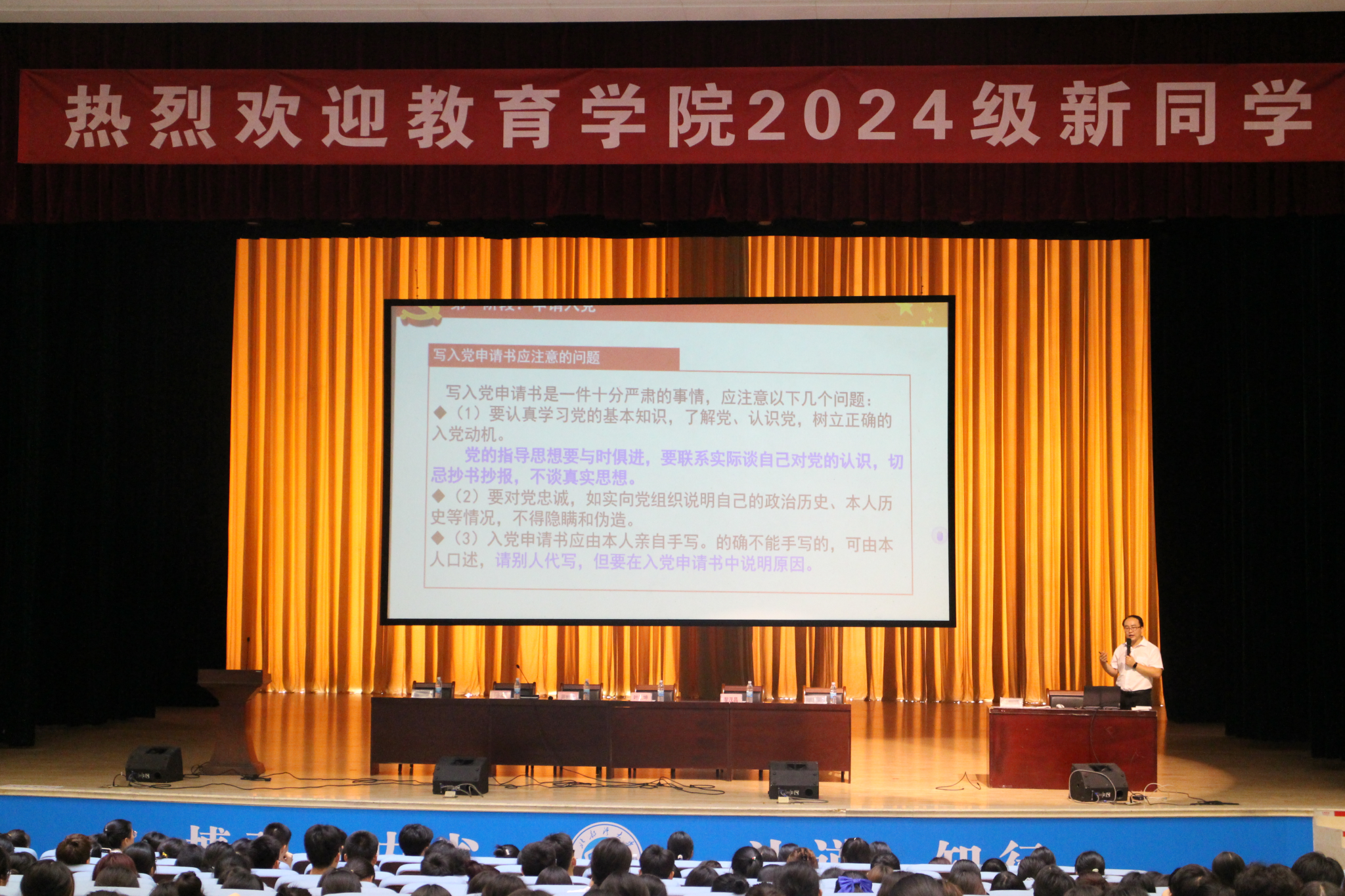 为引领2024级新生主动学习党的理论知识,深化对党的理解认知,树立正确的入党动机并不断向党组织靠拢,9月12日上午,我院于学校礼堂开展2024级新生入党启蒙教育。我院党委书记叶汝坤、党委副书记陈鹏担任主讲人,我院2024级全体新生悉数参加。