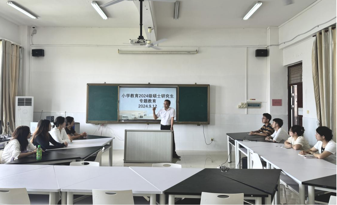 9月12日下午,教育学院副院长尹闯在1A-501教室进行第一专题教育,向2024级研究生新生分别介绍了学校和学院的发展情况、学科点概况、管理模式、学业规划以及相关事务办理流程,让同学们对教育学院有了更加深入的了解。他强调研究生阶段与本科阶段在学习方法、科研能力、时间管理等方面具有显著差异,并鼓励新生们要尽快适应新环境,明确自己的科研目标和科学合理的做好学习计划。