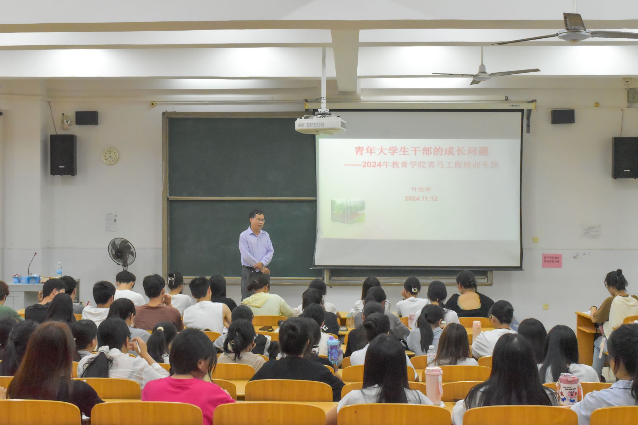 培训会上,叶汝坤书记主要聚焦“青年大学生干部的成长问题”。他分别从学生干部的角色定位、工作性质、成长困惑、工作艺术四个方面,向同学们阐述了作为学生干部的使命与责任。他强调,做人崇德是立身根本,学会学习是成长的基础,学会做事是发展目标,吃亏吃苦是成长成才的艺术。培训最后,叶汝坤书记希望学生干部能在学习与工作之间协调平衡,在集体中发光发热,在个人进步和集体发展中铸就教育学院的新辉煌。
