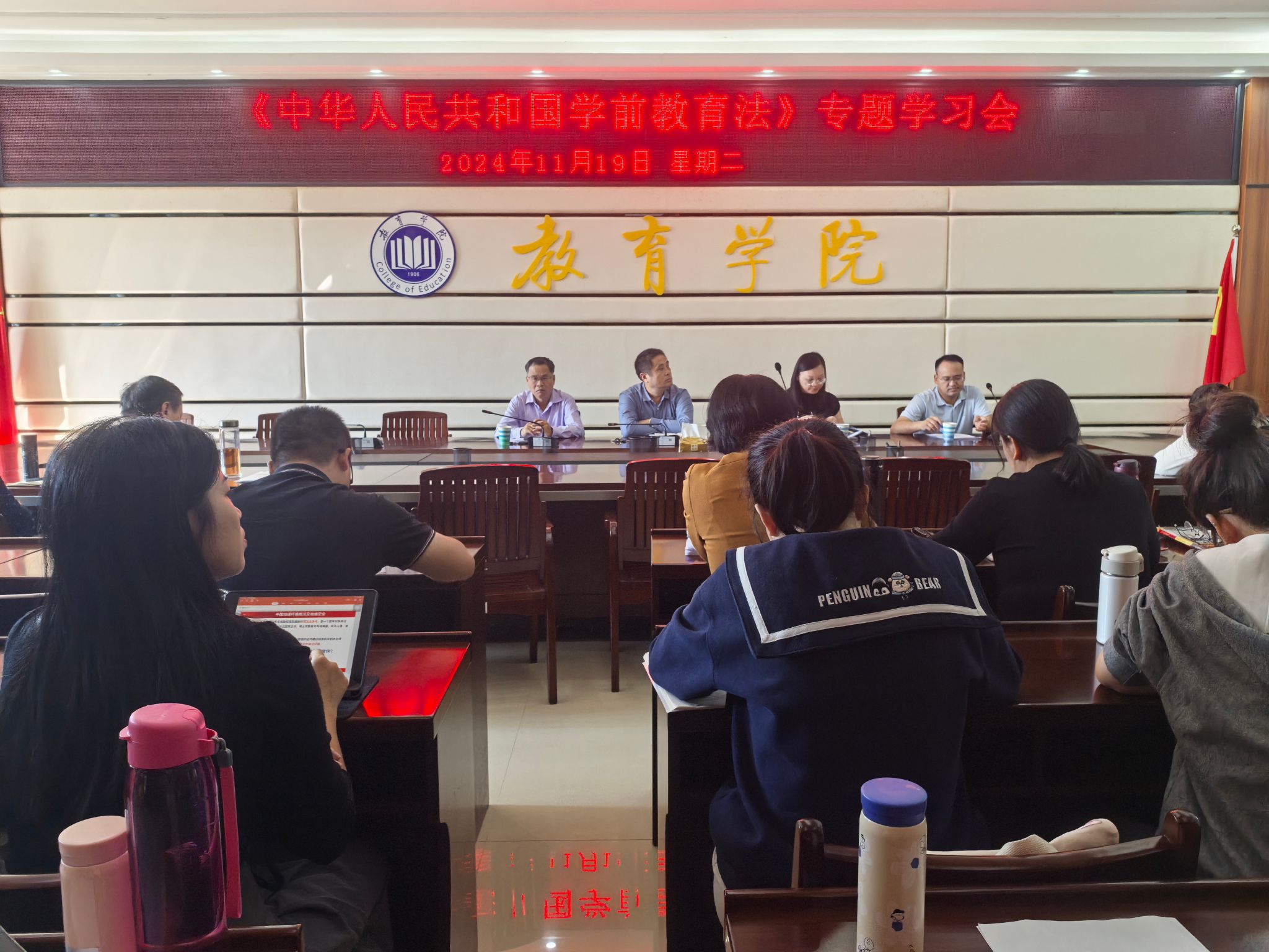 11月19日下午,教育学院召开《中华人民共和国学前教育法》(以下简称《学前教育法》)专题学习会。本次专题学习会由教育学院学前教研室黄丽萍老师主讲,全体教职工参会学习。