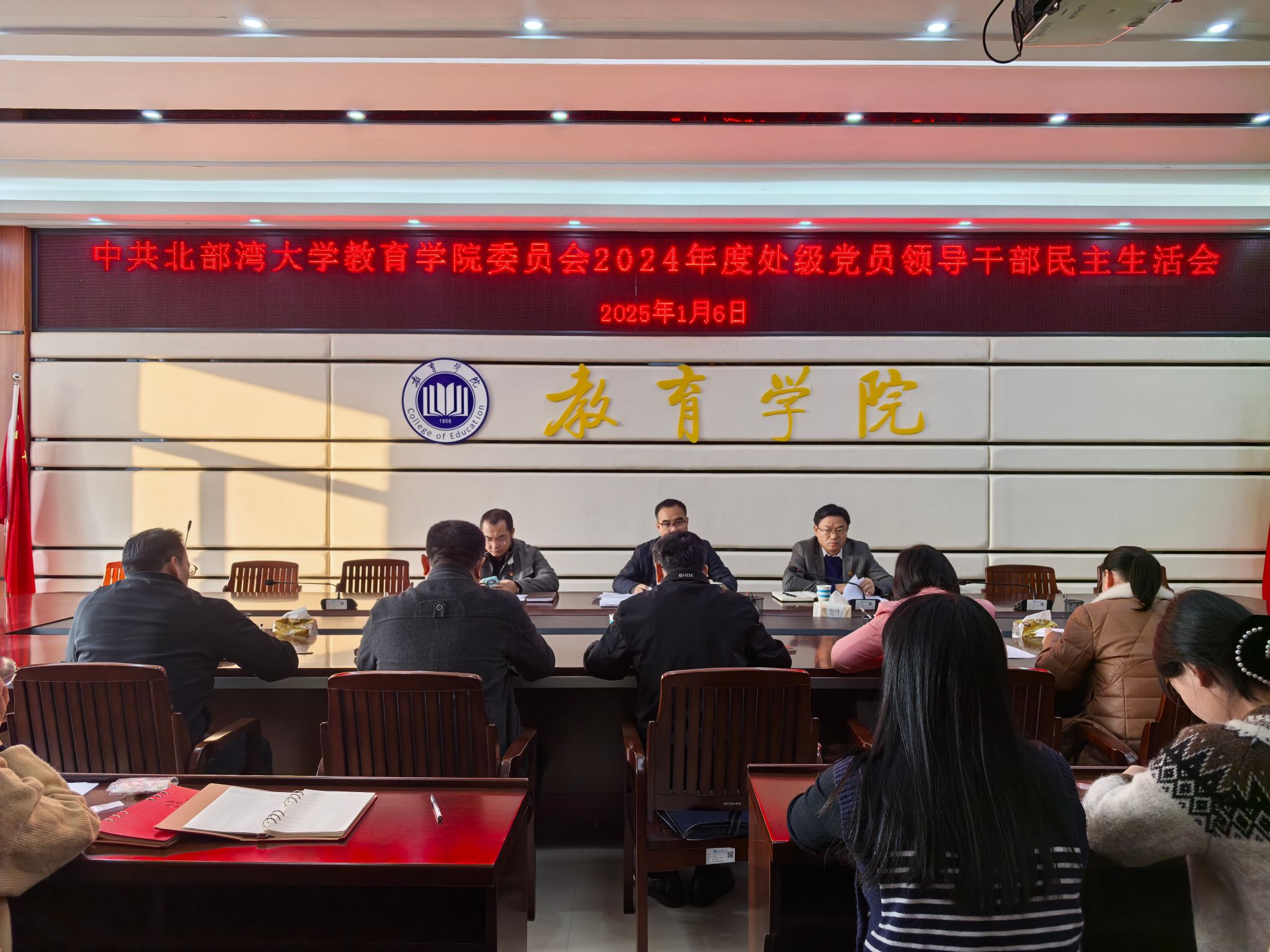 根据《中共北部湾大学委员会组织部关于开好2024年度处级党员领导干部民主生活会的通知(湾大组发〔2025〕2号)要求,2025年1月6日下午,教育学院召开2024年度处级党员领导干部民主生活会。学校党委常委、副校长马秀明,自治区纪委监委驻北部湾大学纪检监察组副组长、学校纪委副书记、党委巡察办公室主任黄学仁,学校党校办副主任、党委统战部副部长黄玮到会指导。会议由教育学院党委书记叶汝坤主持,学院领导班子成员参加,党政办、学工办等部分党员代表列席。