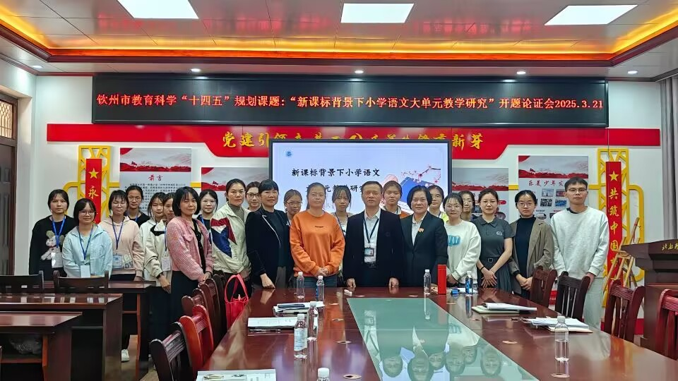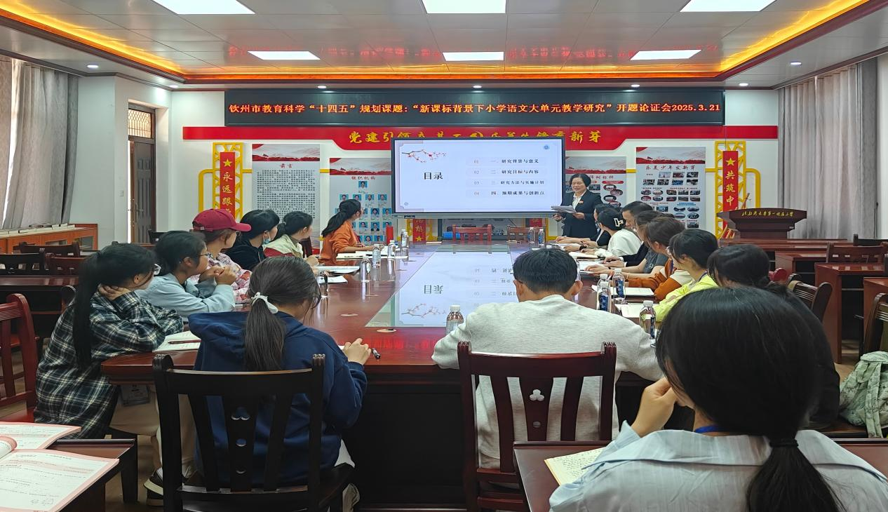 2025年3月21日下午,由北部湾大学教育学院黎爱群副教授主持的钦州市教育科学“十四五”规划课题——“新课标背景下小学语文大单元教学研究”开题论证会在北部湾大学附属小学会议室顺利召开。会议邀请北部湾大学教育学专家何光耀教授、湾大附小教导处主任余晓莉、语文科主任黄桂青、科研主任庞隆清、骨干教师李林波等专家及教师代表出席,课题组团队、湾大附小实习研究生与见习本科生全程参与。余晓莉主任在开场致辞中表示,该课题紧扣新课标改革方向,旨在破解当前小学语文教学实践中的痛点,对推动基础教育高质量发展具有重要意义。