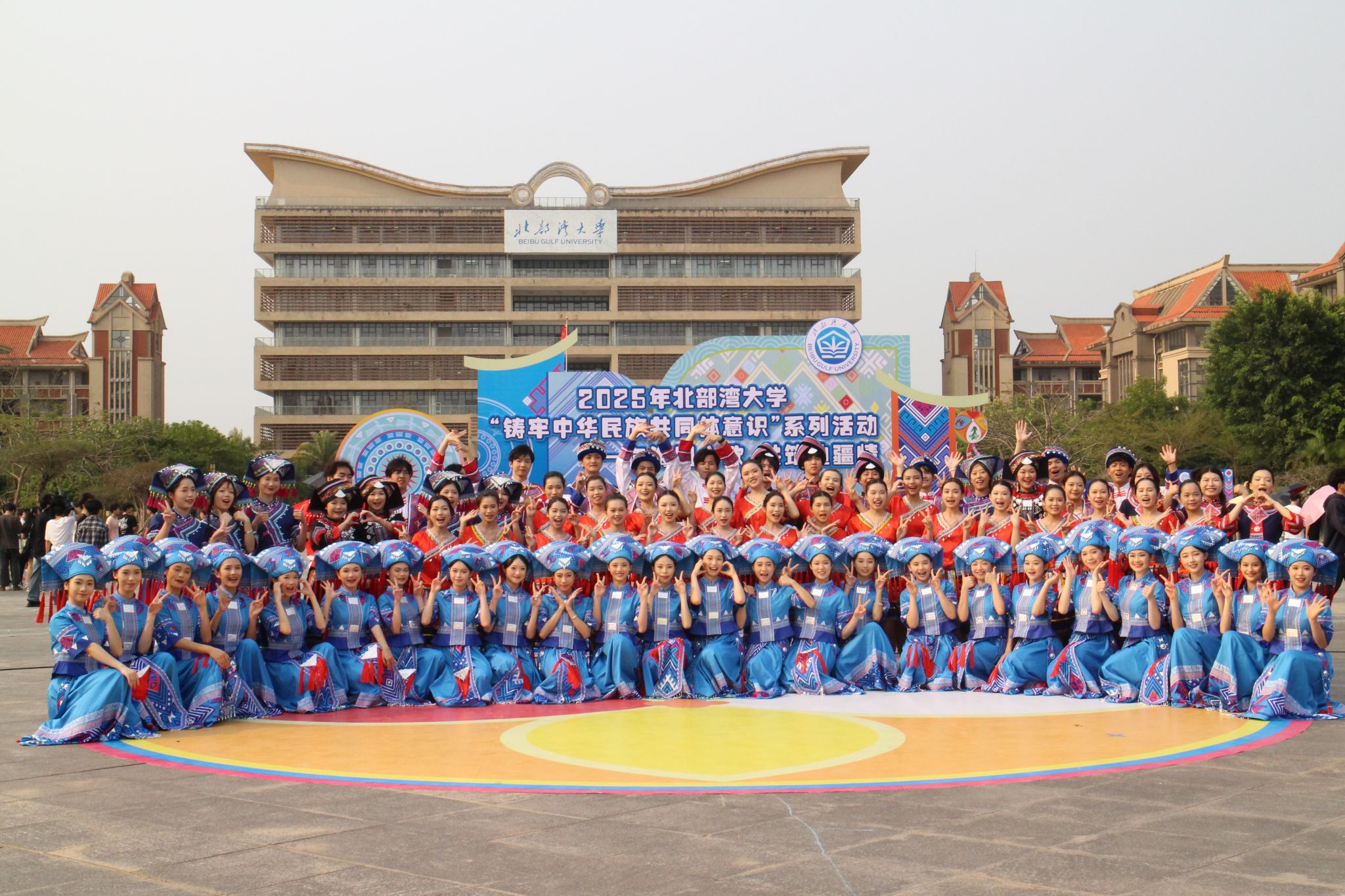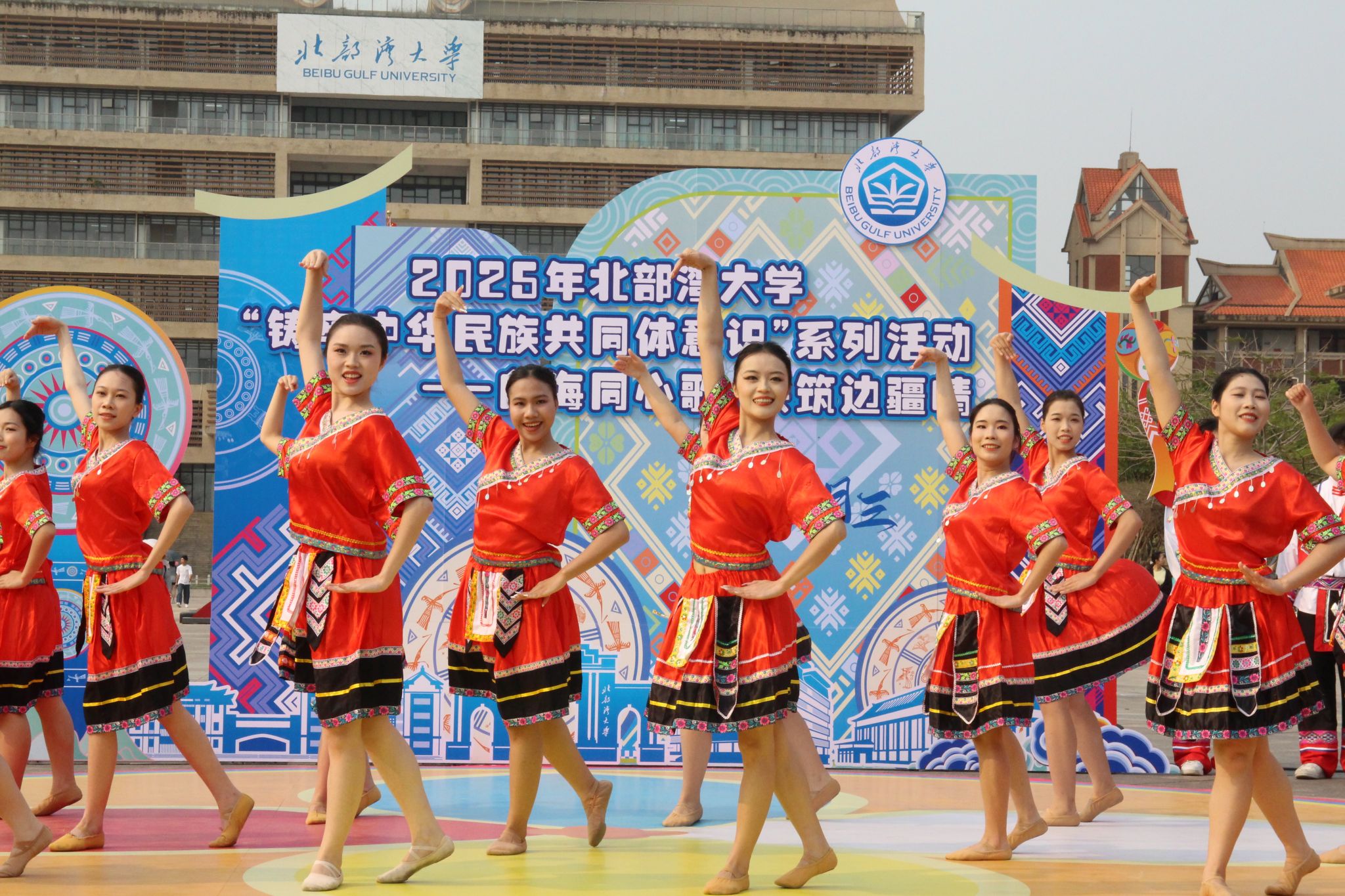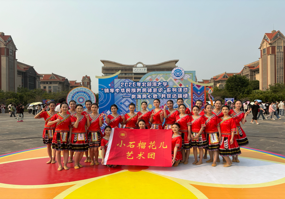 当日下午歌舞盛典中,中心广场化身民族团结的欢乐海洋。教育学院小石榴花儿艺术团以一支壮族舞蹈《歌飘山水间》惊艳全场。22名身着民族服饰的舞者在山歌与铜鼓的韵律中翩然起舞,波澜起伏的队形如广西喀斯特地貌层峦叠嶂,旋转间似千年花山岩画重现人间。每一次踏步都传递着壮乡儿女的坚韧,每一段韵律都诉说着山海相连的民族情谊。演出尾声,身着各民族服饰的演员从观众席涌向舞台,在《哈尼宝贝》欢快旋律中,百余名师生手挽手结成同心圆,以交融的舞步诠释“中华民族一家亲”的深刻内涵,将铸牢中华民族共同体意识的信念化作青春注脚。