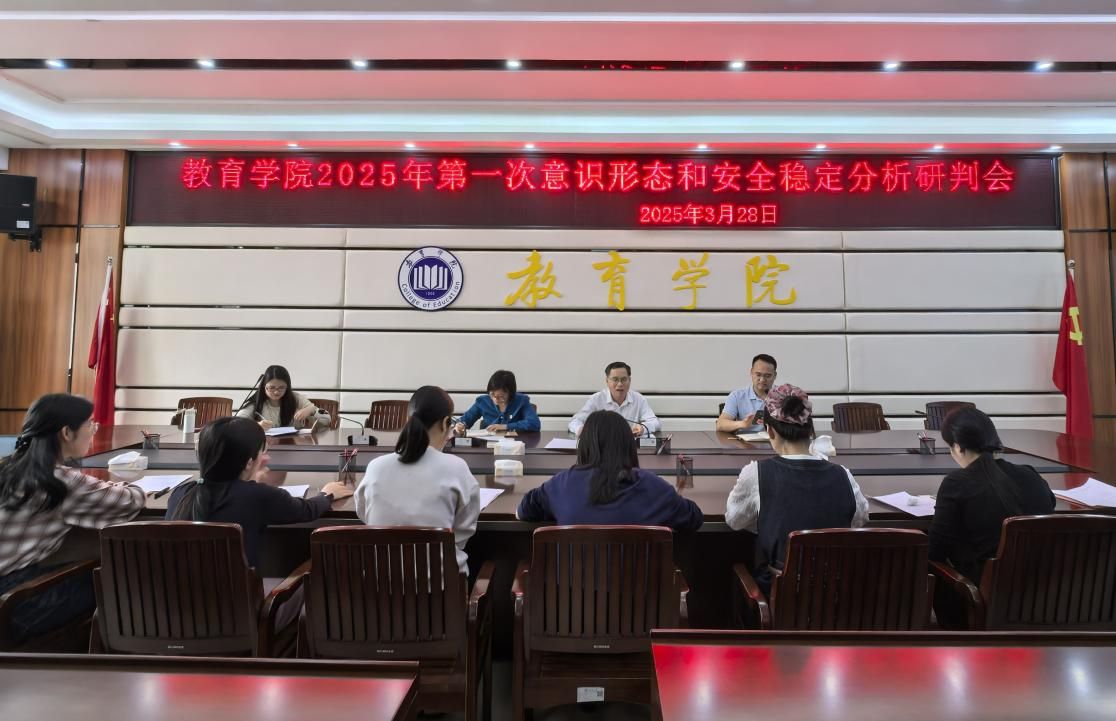 为深入贯彻落实习近平总书记关于意识形态和安全稳定工作的重要论述,2025年3月28日上午,教育学院于412会议室召开本年度第一次意识形态和安全稳定分析研判会。会议由教育学院党委书记叶汝坤主持,党委委员、各党支部书记参会。