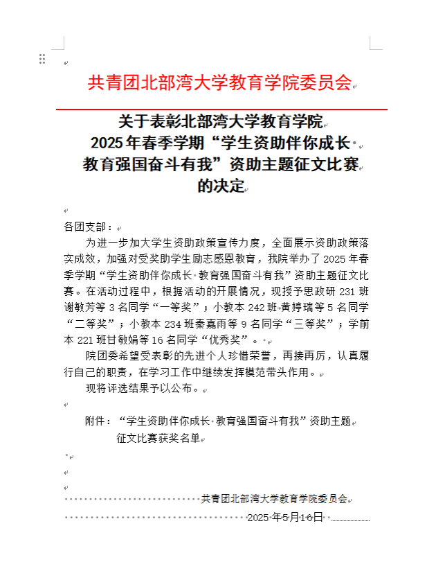 2025年4月30日至2025年5月12日,教育学院举办“学生资助伴你成长 教育强国奋斗有我”资助主题征文比赛。