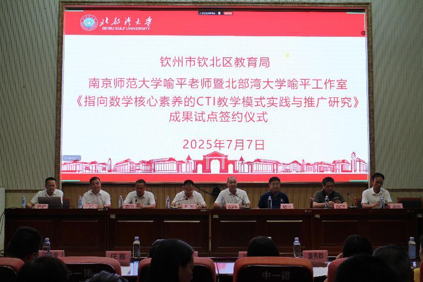 7月7日上午,我校成功举行《指向数学核心素养的CTI教学模式实践与推广研究》成果试点签约仪式暨“北部湾大学喻平工作室”揭牌仪式。钦州市钦北区教育局、南京师范大学喻平教授团队与北部湾大学正式启动深度合作,旨在将先进教学研究成果转化为区域教育发展的强劲动力。