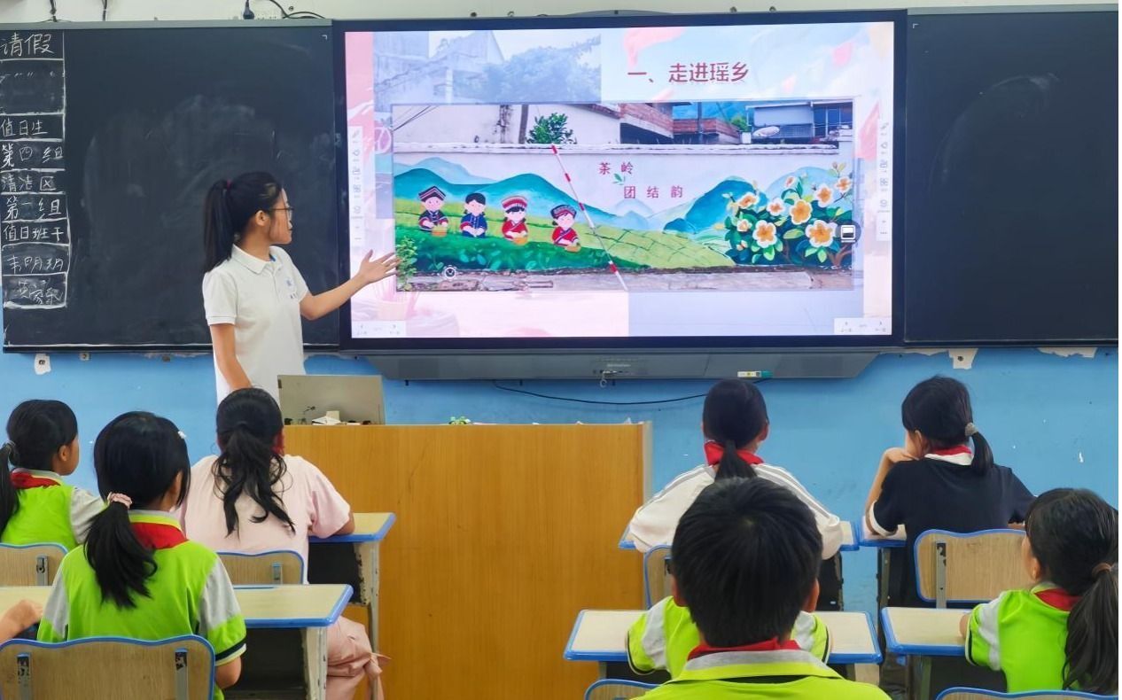 同步展开的还有十万山瑶乡中心小学的主题为 “瑶乡焕彩映山河,青春绘梦书华章” 公益课堂。课堂上,师生们通过综合运用多媒体展示、互动提问、实践操作等多样化的课堂方式,有效助力孩子们深入了解瑶乡文化,让民族团结教育入脑入心。师生们引导瑶乡儿童通过涂色绘制,感知家乡文化魅力。课堂上的互动问答与画笔涂抹声交织,让民族团结的种子在童心中悄然萌芽。