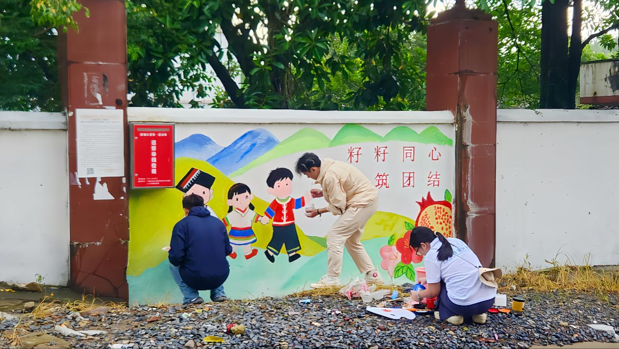 服务团成员进行“籽籽同心,共筑团结”主题墙绘