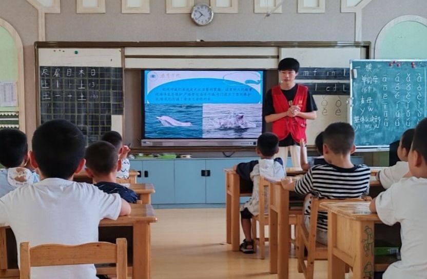志愿者向幼儿园小朋友介绍钦州中华白海豚