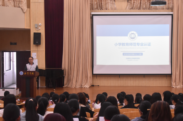 为加深小学教育专业学生对师范专业认证有关知识的了解并对本专业有清晰定位,我院于11月16日下午在1B-115召开了小学教育专业认证学生培训会。此次会议由我院党委副书记陈鹏主讲,学工办主任韦春林主持。