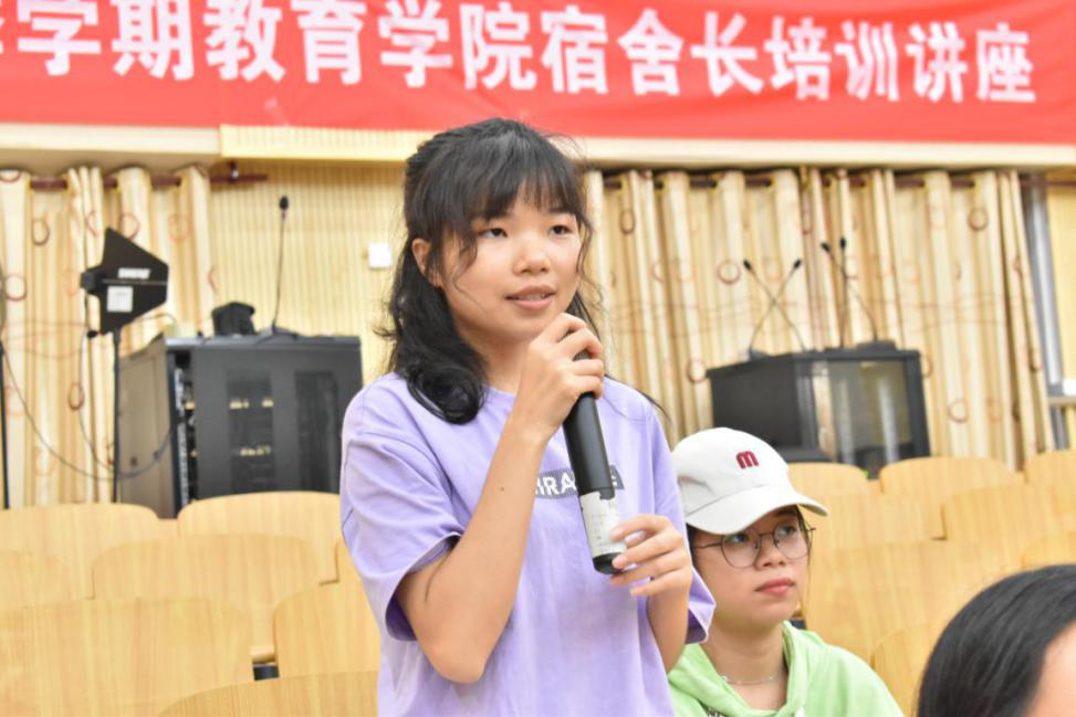 讲座上,张蔓燕老师从管理制度、人际交往和塑造自我三个方面,向舍长们讲解如何更好地展开管理宿舍的工作。首先,张蔓燕老师详细介绍了学校的宿舍规章制度,提出要营造好宿舍的和谐氛围,每个同学都要自觉遵守纪律。其次,张蔓燕老师引用友谊相关句段讲述了培养良好人际关系的重要性,希望同学们能与他人和睦相处。最后是自由提问环节,同学们踊跃提问,张蔓燕老师耐心的为同学们解答问题,现场氛围热烈。