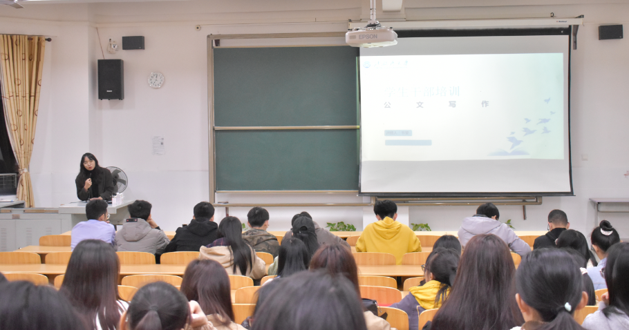 首先,韦莹老师指出公文写作对于同学们日后开展的工作有着不可代替的作用。接着,她针对公文写作中的通知、邀请函、主持稿以及策划书等方面分别作了详细的阐述,并通过自身经历以及写作经验来向同学们讲解了公文写作的要求,同时列举了多个代表性的例子,让同学们更深入的了解到公文写作的各项技巧和注意事项。在此过程中,韦莹老师让与会人员现场练习撰写一则关于组织比赛的通知,就业培训部负责人农晶晶、新团员韦玉鸿分享了自己的写作技巧,同学们相互交流,共同取长补短。经过韦莹老师的培训后,大部分的同学表示收获颇丰,学习到公文写作的新知识。