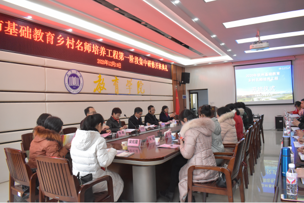 12月19日上午,在北部湾大学教育学院1B-412会议室举行了2020年钦州基础教育乡村名师培养工程开班仪式。我校党委副书记陈锦山、钦州市教育局局长赖廷耀、钦州市副局长田茂群、我院党委副书记陈鹏、副院长黎茂昌出席本次开班仪式,与会的还有本次培养工程的导师团队及学员。开班仪式由黎茂昌副院长主持。