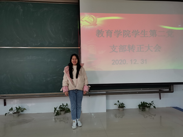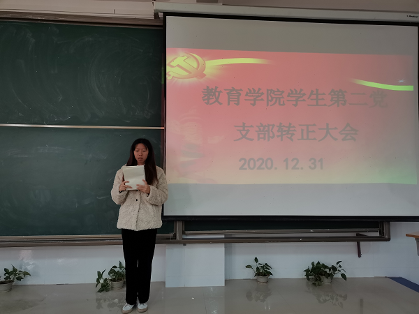 2020年12月31日,教育学院学生第二党支部在1A-209召开2020年秋季学期专升本预备党员转正大会,会议主要讨论唐春晓和郑积艳2名预备党员转为正式党员的问题,出席本次会议的有教育学院学生第二党支部书记陈婧、教育学院学生第二党支部副书记黄丽萍及支部全体党员,会议由支部组织委员邹淦同志主持。