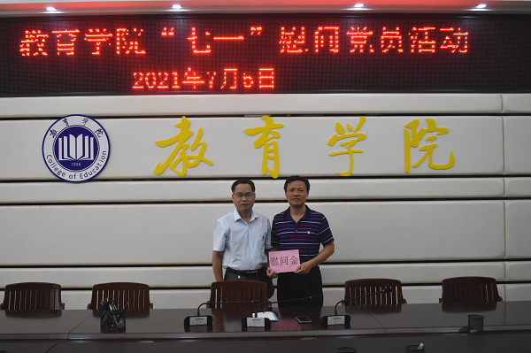 为纪念党的百年华诞,弘扬党的光荣传统和优良作风,充分体现党组织对党员的关怀和爱护,7月5日下午,我院于1B-412会议室开展“七一”党员慰问活动。我院党委书记叶汝坤代表学院党委向突出贡献教师何光耀、张传月、李燕清以及困难学生党员代表卜美丽表示慰问。