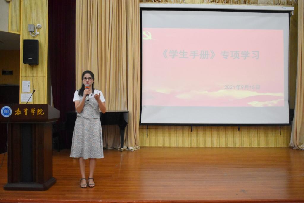 为进一步贯彻落实学校“学手册,知规范,见行动”主题教育活动要求,9月14日至16日,我院于1B-115报告厅召开《学生手册》专项学习会。本次会议由辅导员韦春林、曹桂磊、李想主讲,学前教育专业及小学教育专业2021级新生参加了本次会议。