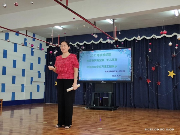 2021年9月30日上午,学前专升本201班南区一幼实习小组在钦州市钦南区第一幼儿园礼堂进行公开课展示并召开实习总结大会。本次活动由南区一幼教导处主任何丽平主持,南区一幼园长钟景丽、各年级教研组长、各班主班老师和北部湾大学教育学院副院长黎茂昌、教务员黄春艳、带队老师施又丹、学前教研室助理黄丽萍出席本次活动。