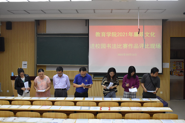 为培育和践行社会主义核心价值观,提高师范学子的综合素质和职业素养,丰富校园文化生活,营造浓厚的校园文化氛围,充分展现中国书法的艺术魅力,我院于2021年10月11日举办了以“廉政文化进校园,清风正气润心田”为主题的书法比赛。我院同学积极参与,共提交了211幅比赛作品。11日下午,我院党委书记叶汝坤莅临指导,我院党委副书记陈鹏、学工办主任韦春林、辅导员曹桂磊、曾允金、李想、陈琪对参赛作品进行评分。