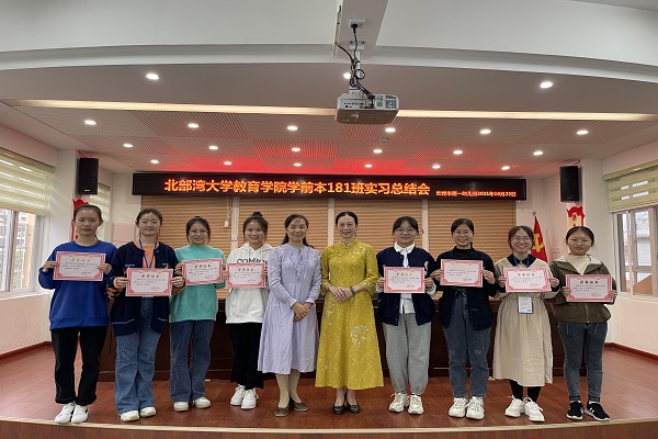 在总结交流会上,实习生与幼儿园领导老师们深入坦诚地交流了本次实习的收获与体会。首先,小班实习生代表庞基艳、中班实习生代表杨琦敏、大班实习生代表黄柳艳分别分享了实习心得体会,讲述了实习的点点滴滴,表达了对幼儿园以及幼儿的不舍,并感谢幼儿园与幼儿园指导老师在教育知识、教育技能、教育理念等方面的指导。其次,幼儿园教师代表蓝雯瑜老师发言,蓝老师充分认可实习生热爱儿童、热心协助班级工作的态度。黄清莲主任和黄真华主任也对实习生一开始面对真实教育情境手足无措到游刃有余的进步表现表示肯定,“学然后知不足,教然后知困”,两位主任也希望实习生们看到自己的优势与不足,继续完善自身的专业能力。带队老师黄丽萍分享了在幼儿园观察到的彰显儿童视角的教育案例,也对幼儿园给予实习生的学习机会表示感谢。随后马忠红园长从专业能力、教育情怀、师德师风、职业规划的角度对实习生表示深切的勉励与殷切的期望,希望实习生能积极投入学前教育工作,做一个有理想信念、有道德情操、有扎实学识、有仁爱之心的幼儿园教师。发言完毕后,马忠红园长和黄真华主任为优秀实习生颁发奖状。最后,实习带队黎爱群老师代表教育学院感谢幼儿园对同学们的照顾与指导,希望同学们铭记师长的教诲,把学到的知识与技能应用到实践中去,并代表实习小组向幼儿园送上感谢信,幼儿园领导、老师与全体实习生合影留念。至此,学前本181班在钦州市第一幼儿园的教育实习活动圆满结束。