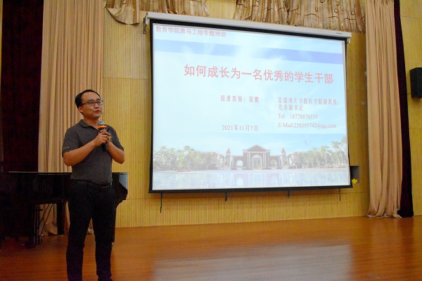 为了让学生干部更好地明确职责,提高学生干部的综合素质与能力,11月7日晚,我院于1B-115报告厅开展了2021年青马工程培训活动之“如何成为一名优秀的学生部”培训会议。本次会议由我院党委副书记陈鹏担任主讲人,我院分团委学生会全体成员参加了本次会议。