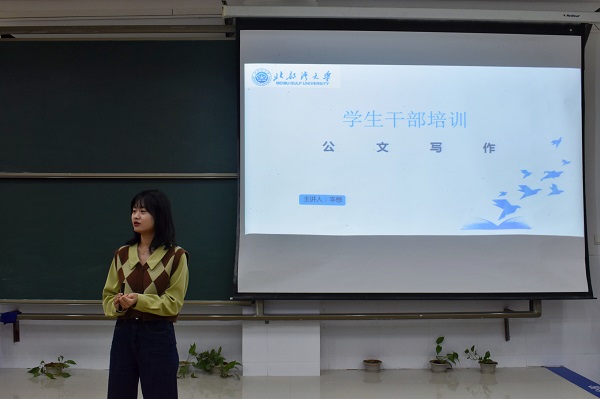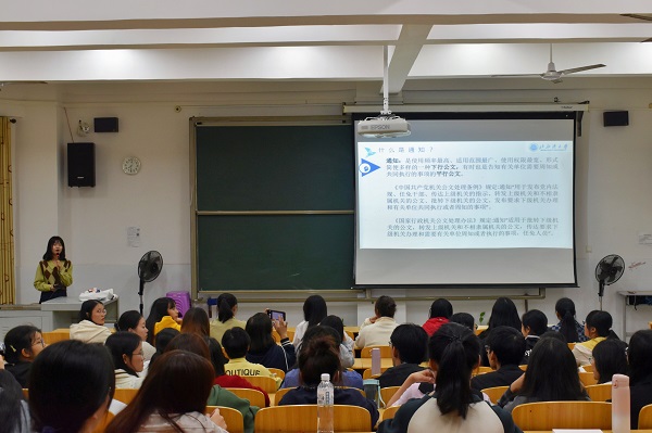 在培训过程中,李想老师首先以通知、主持稿和策划书三个常见公文为例,向同学们讲述了有关公文写作的基础知识,并详细阐述了公文的规范体式。接着,李想老师从公文文头、正文、文尾入手,向同学们较为深入地介绍了公文写作的技巧。她指出:公文写作是师范生的必备技能,掌握基本的公文写作技能对同学们今后就业有很大的帮助。最后,李想老师围绕“为什么要当选学生干部”这一话题与在座同学进行探讨。同学们积极发言,各抒己见,展示出师范生良好的精神风貌。活动在同学们热烈的掌声和满满的收获中圆满结束。