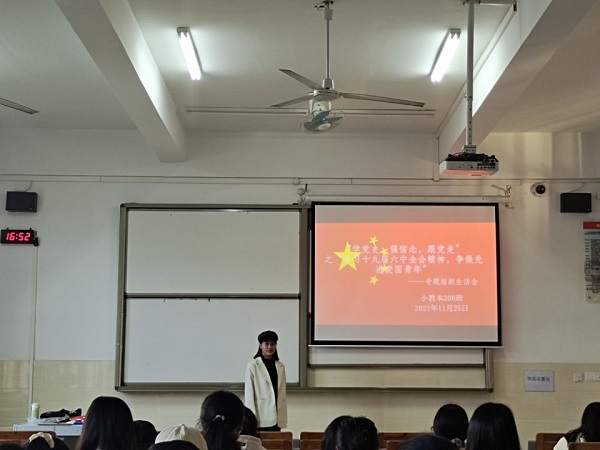活动伊始,组织委员杨营敏带领全班同学一起学习党的十九届六中全会的主要内容,让同学们深入地学习党的十九届六中全会精神,激发同学们爱党、爱国、爱社会主义的热情,争做先进爱国青年。接着,团支书黄海霞跟同学们分享她学习了党的十九届六中全会精神之后的感受和今后对自己的要求,她表示,我们作为新时代青年,应当把个人的成长成才与国家繁荣发展结合起来,为中华民族伟大复兴积蓄力量,做一名先进的爱国青年,其他同学也积极发表了他们对如何成为先进爱国青年的看法。最后,组织委员杨营敏对本次专题组织生活会做了总结,全班同学合影留念。