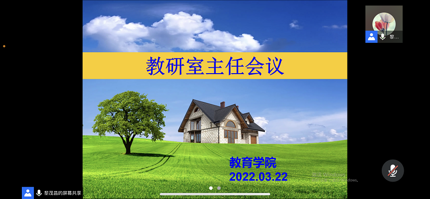 2022年3月22日晚上8点,教育学院召开3月份教研室主任线上会议,会议由黎茂昌副院长主持,小学教育教研室主任康书豪、副主任梁苑霞、王婉聪,学前教育教研室主任韦芳、副主任李佳烨、主任助理施又丹、黄丽萍,教师教育公共教学部主任王奕冉、副主任陈颖,教师教育综合实训中心主任曾允金参会。