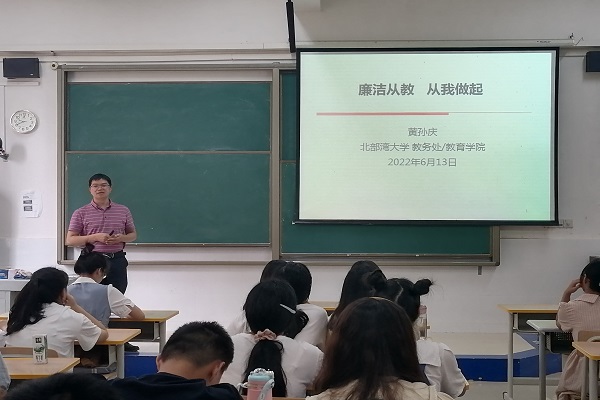 首先,黄孙庆老师结合古今事迹,从价值评判标准、价值理想、价值取向和道德层次等方面论述了廉洁是中华民族的传统美德。其次,黄孙庆老师从廉洁从教的涵义与意义两方面出发,让同学们知道廉洁从教是现代教师的职业道德,明白廉洁从教的重要性。而后,黄孙庆老师从主客观两方面分析从教不廉的原因,指导同学们从教不廉的价值观该如何矫正,教会同学们该如何加强自我修养,做廉洁从教楷模。最后,黄孙庆老师表示,教师廉洁从教永远在路上,需要我们不断践行,希望同学们珍惜大好学习时光,继续地保持谦虚、谨慎、不骄、不躁的作风,继续地保持艰苦奋斗的作风,更好地为国争光、为民造福,争做廉洁教师!