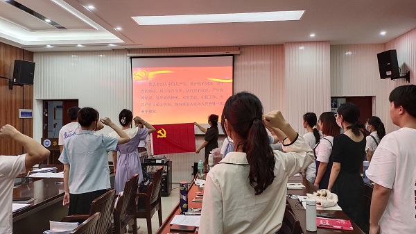本次支部大会主要讨论杨培云等十六名同志接收为中共预备党员的问题。会议伊始,主持人介绍了预备党员接收大会的流程,并严格按照要求逐项开展。杨培云等十六名同志依次宣读了入党志愿书以及汇报个人对党的认识、入党动机、本人基本情况等。随后,各入党介绍人介绍转正同志的主要情况,并对其能否加入党组织表明意见。听取汇报后,与会党员充分讨论,对照党员条件对16名同志能否接收入党进行商议。最后,与会正式党员采取不记名投票的方式进行表决。经决议,全员经过投票同意接收杨培云等十六名同志为中国共产党预备党员。支部正式党员卢雅带领全体同志宣读入党誓词。