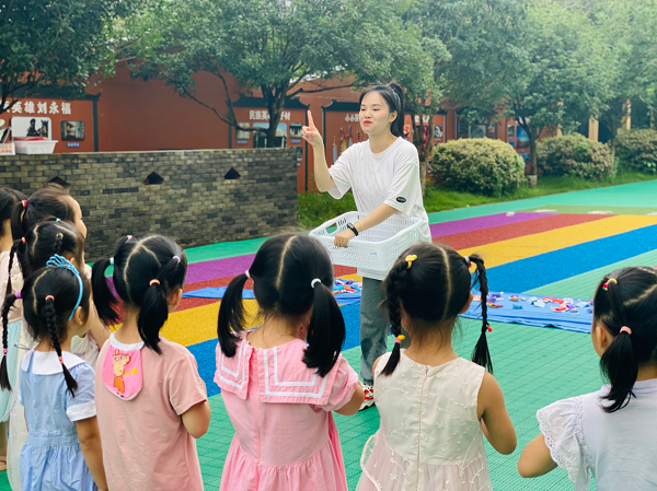 6月14日下午,教育学院学前教研室唐上洁老师带领学前教育专业学生到钦州市第二中学附属幼儿园组织一次校外精彩的“课程思政”示范课程建设的活动——《幼儿园主题游戏设计:海洋之乐》。本次活动由学前教育专升本212班的韦琳怡同学作为代表,组织中班游戏:“海浪来了,快跑”。参加本次活动的还有二中附属幼儿园李淑莲园长、刘曦副园长及部分骨干幼儿园教师。