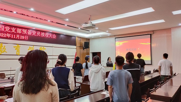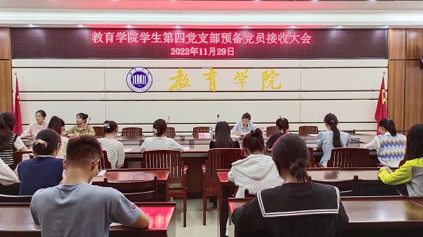为壮大支部党员队伍,增强支部力量,为党组织汇入新鲜血液,11月29日晚,教育学院学生第四党支部于1-412会议室召开了2022年秋季学期预备党员接收大会。我院学生第四支部书记归妙玲以及支部全体党员、发展对象参加此次会议。本次会议由沈怡冰同志担任主持人。