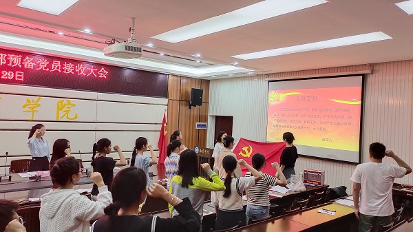 本次支部大会的主题是讨论庞大鑫等6名同志的发展问题。会议伊始,全体党员、发展对象起立,奏唱国歌。其次,主持人宣读预备党员接收大会流程,并严格按照要求逐项进行。接着,庞大鑫等6名同志依次宣读入党志愿书以及向党组织汇报对党的认识、入党动机、现实表现等,入党介绍人对其能否加入党组织表明意见,同时与会党员对照党员条件对庞大鑫等6名同志能否入党进行讨论,充分发表意见。随后,由到会的正式党员采取不记名投票的方式进行表决。经决议,全员经过投票同意接收庞大鑫等6名同志为中国共产党预备党员。最后,由党员苏雅婷带领全体同志宣读入党誓词。