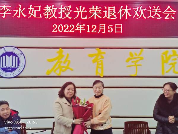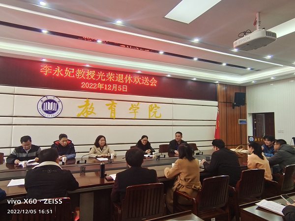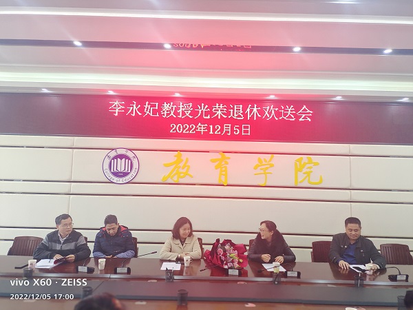 2022年12月5日,教育学院为李永妃教授举行退休欢送会。欢送会由学院党委书记叶汝坤主持。离退休工作处副处长封彬贤、校工会副主席莫秀群、学院领导班子成员、2020年以来入职的教师参加欢送会。