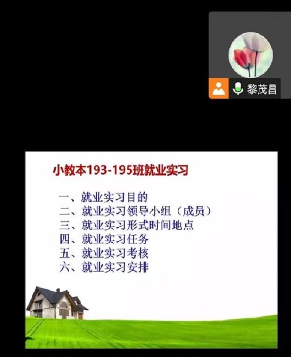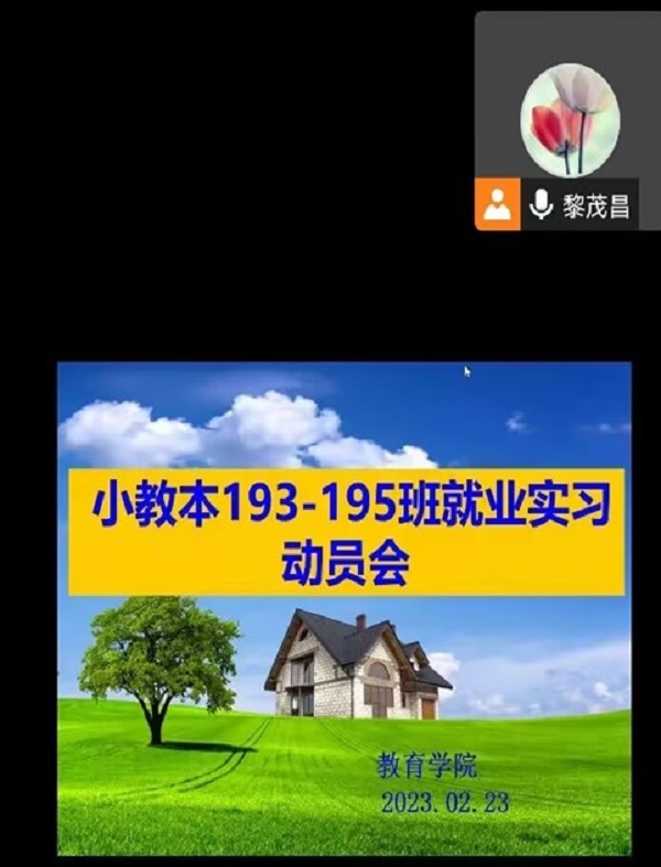 为了更好地开展我院小学教育专业就业实习工作,使学生了解实习要求,明确实习目标,2月23日晚上,我院召开了小教本193-195班就业实习动员会,会议由我院副院长黎茂昌主持,我院党委副书记陈鹏、各实习指导老师以及小教本193、194、195班全体学生参加本次动员会。由于部分同学不在钦州实习,故动员会采取线上方式进行。