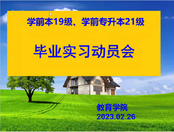 毕业实习是人才培养的一个重要环节,为确保毕业实习工作的顺利开展,我院于2023年2月26日上午9:00召开了学前本19级、学前专升本21级毕业实习动员会。会议由黎茂昌副院长主持,陈鹏副书记、实习指导老师、学前本2019级、学前专升本2021级全体学生参加了本次会议。