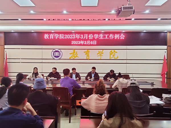 2023年3月6日下午,教育学院于1A-412会议室召开了2023年3月份学生工作例会。我院党委书记叶汝坤、党委副书记陈鹏、党政办公室主任张珂、学工办副主任曹桂磊、全体辅导员以及班主任参加会议。