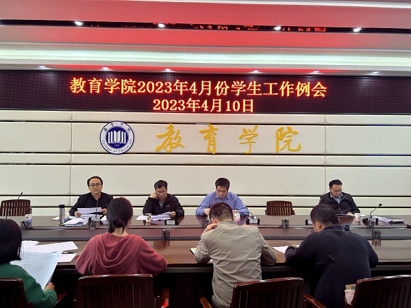 2023年4月11日下午,教育学院于1A-412会议室召开了2023年4月份学生工作例会。我院党委书记叶汝坤、党委副书记陈鹏、院长周顺平、副院长尹闯、学工办副主任曹桂磊、全体辅导员以及班主任参加会议。
