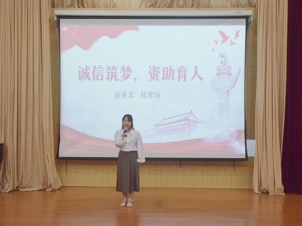 为贯彻落实党的二十大精神,培育受助学生的爱党爱国情感和诚信感恩意识,进一步推进我院学生资助政策宣传工作,6月10日晚,我院于1B-115报告厅举行“我与诚信有个约定”主题演讲比赛。我院教师施又丹、韦莹,辅导员李想出席本次比赛。